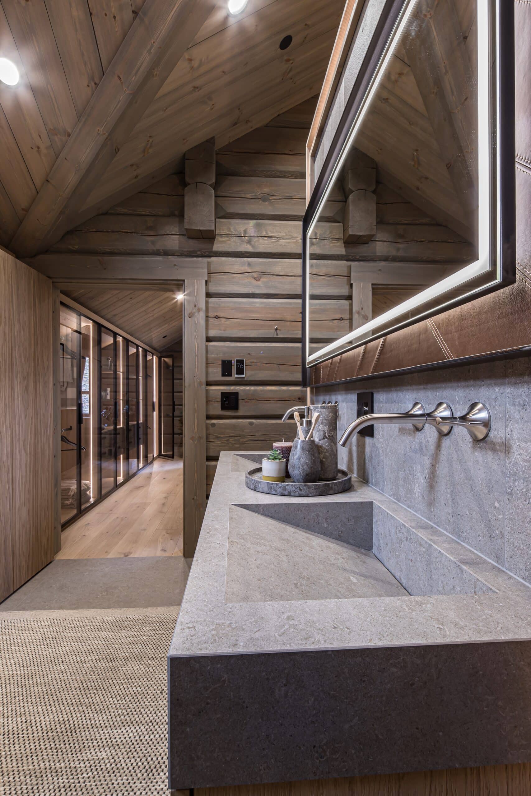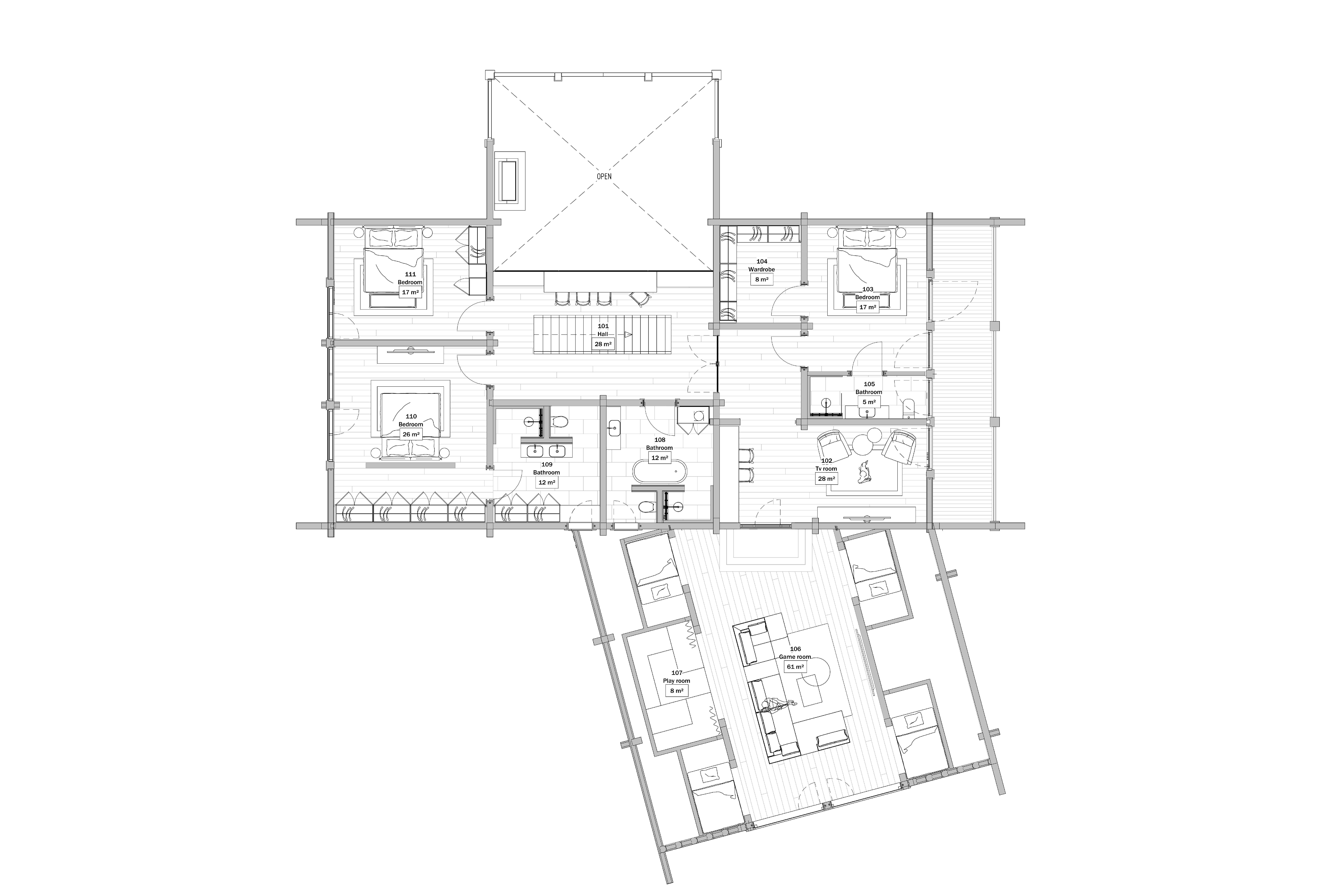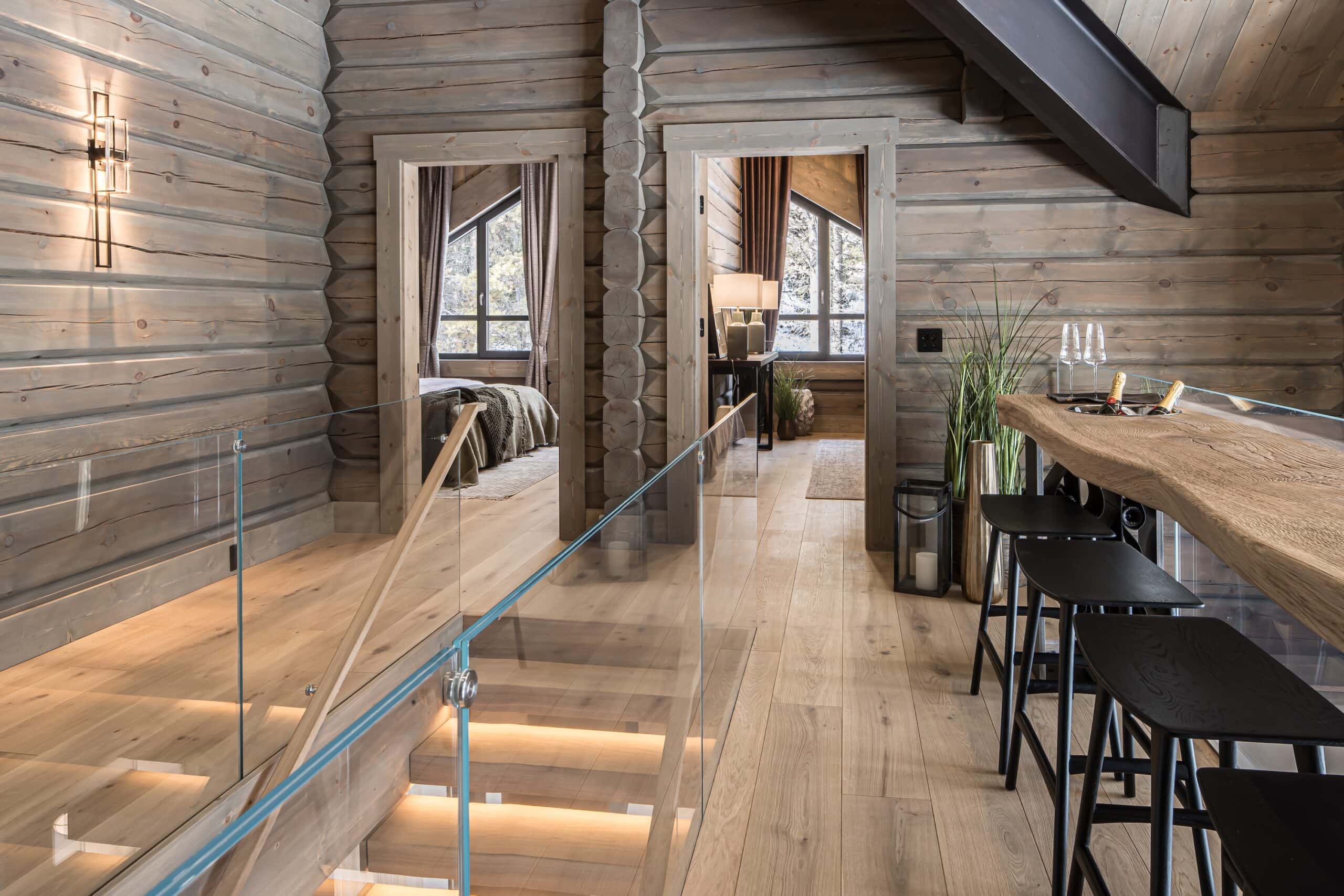 The first floor features half-timbered timber with vertical panels, offering increased flexibility in room layout and cabin furnishing. This floor showcases a modern appearance with its vertical wall panels and decorative microcement, while the second floor exudes traditional loft style, characterized by horizontal logs. The use of normal trusses on the first floor allows for versatile room division, preserving a modern aesthetic.