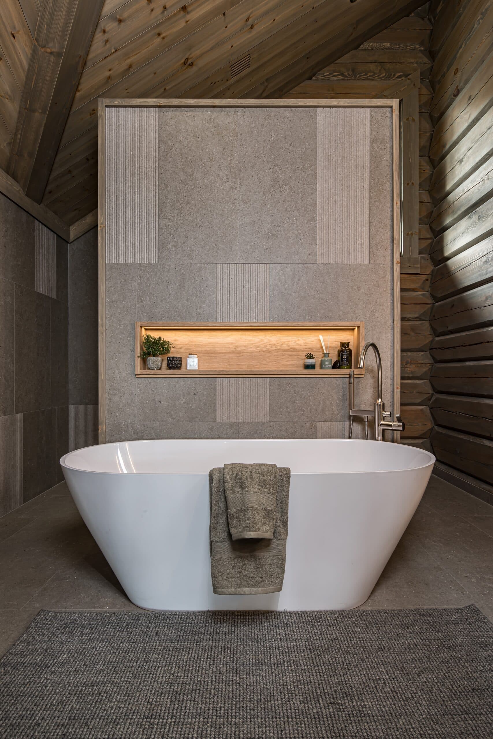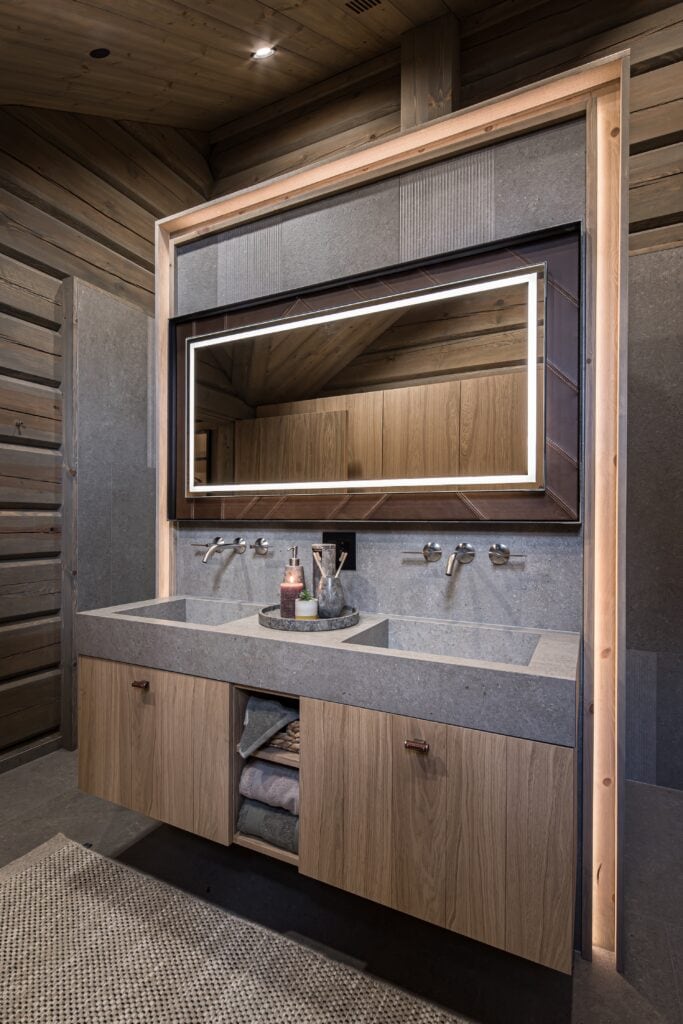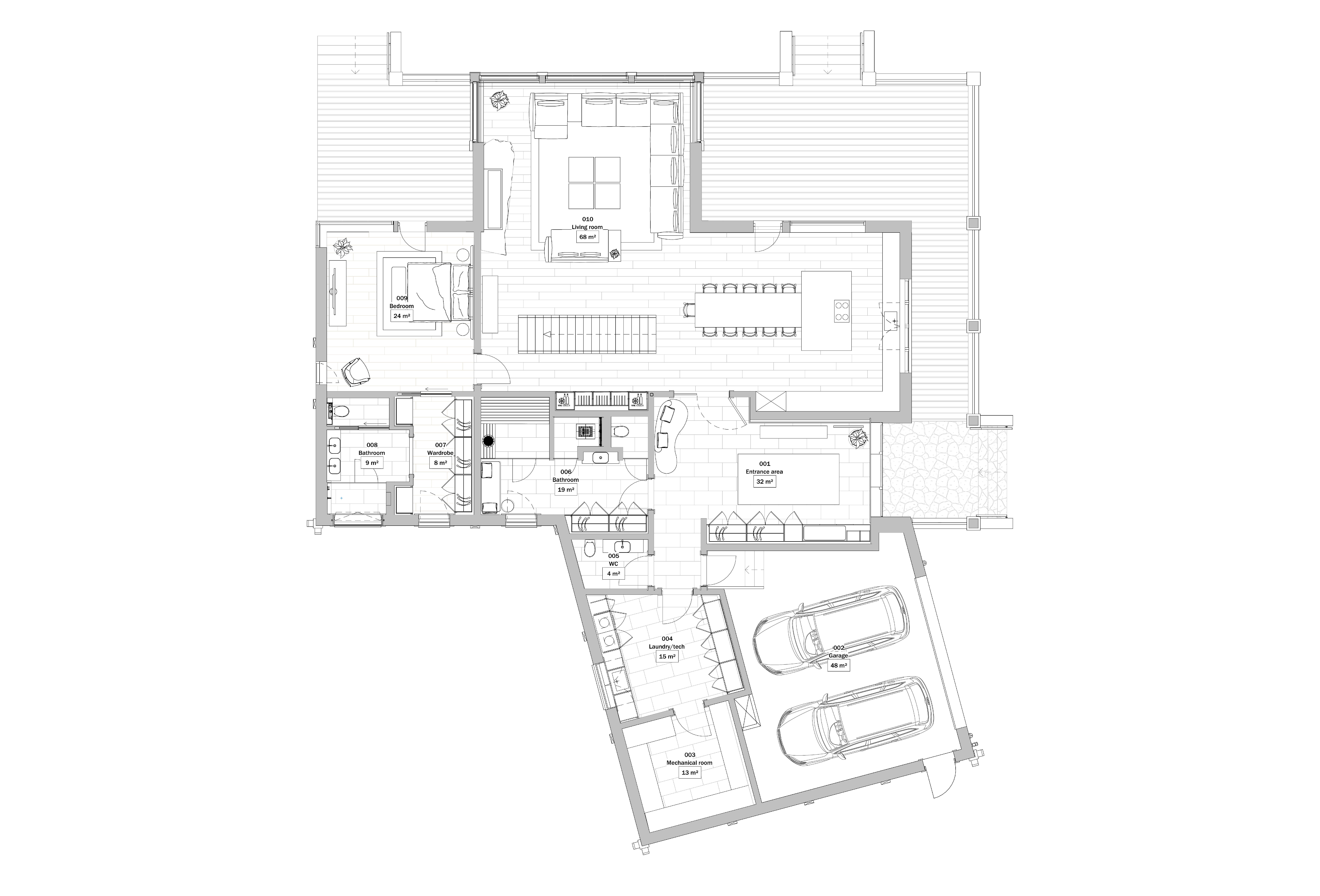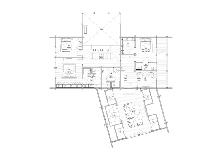 The first floor features half-timbered timber with vertical panels, offering increased flexibility in room layout and cabin furnishing. This floor showcases a modern appearance with its vertical wall panels and decorative microcement, while the second floor exudes traditional loft style, characterized by horizontal logs. The use of normal trusses on the first floor allows for versatile room division, preserving a modern aesthetic.