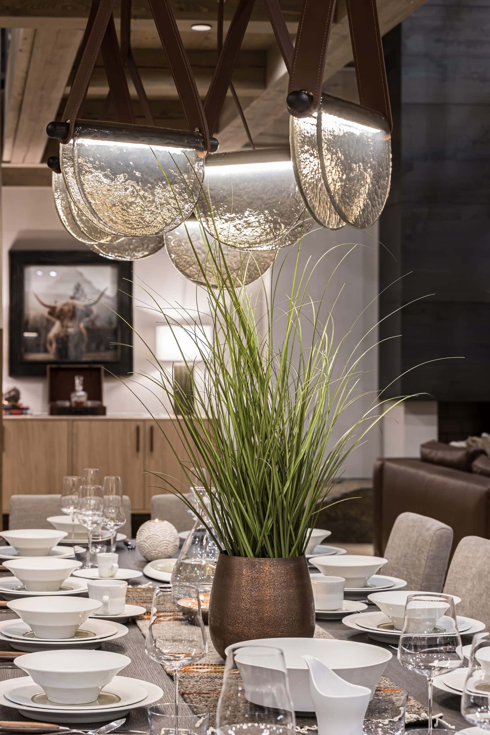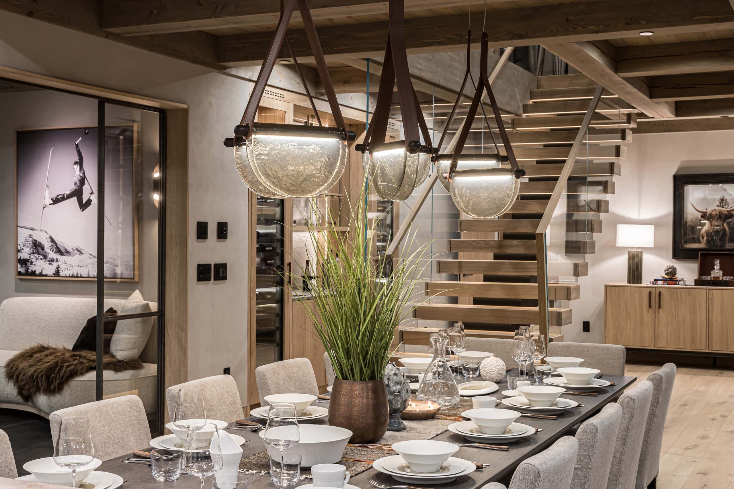 Moving deeper into the home, the hallway opens into an expansive open-plan kitchen and dining area designed as the social heart of the residence. A large kitchen island anchors the space, complemented by a full dining zone ideal for hosting family and guests. Floor-to-ceiling glazing opens directly onto the surrounding terraces, seamlessly extending indoor living to outdoor relaxation and dining areas while framing spectacular mountain views.