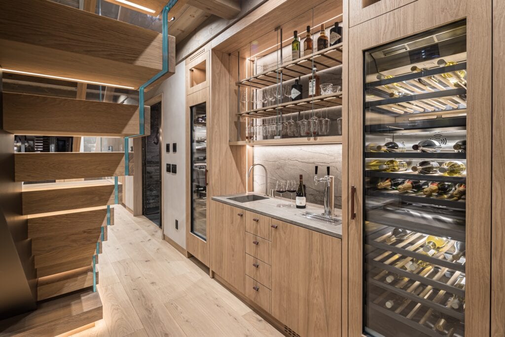 The adjacent wine and bar lounge features the same Caesarstone surfaces, two Gaggenau wine coolers (approx. 200-bottle capacity), illuminated oak shelving, a private beer tap, and integrated glass storage — creating a refined entertaining space that completes this elegant social core of the home.