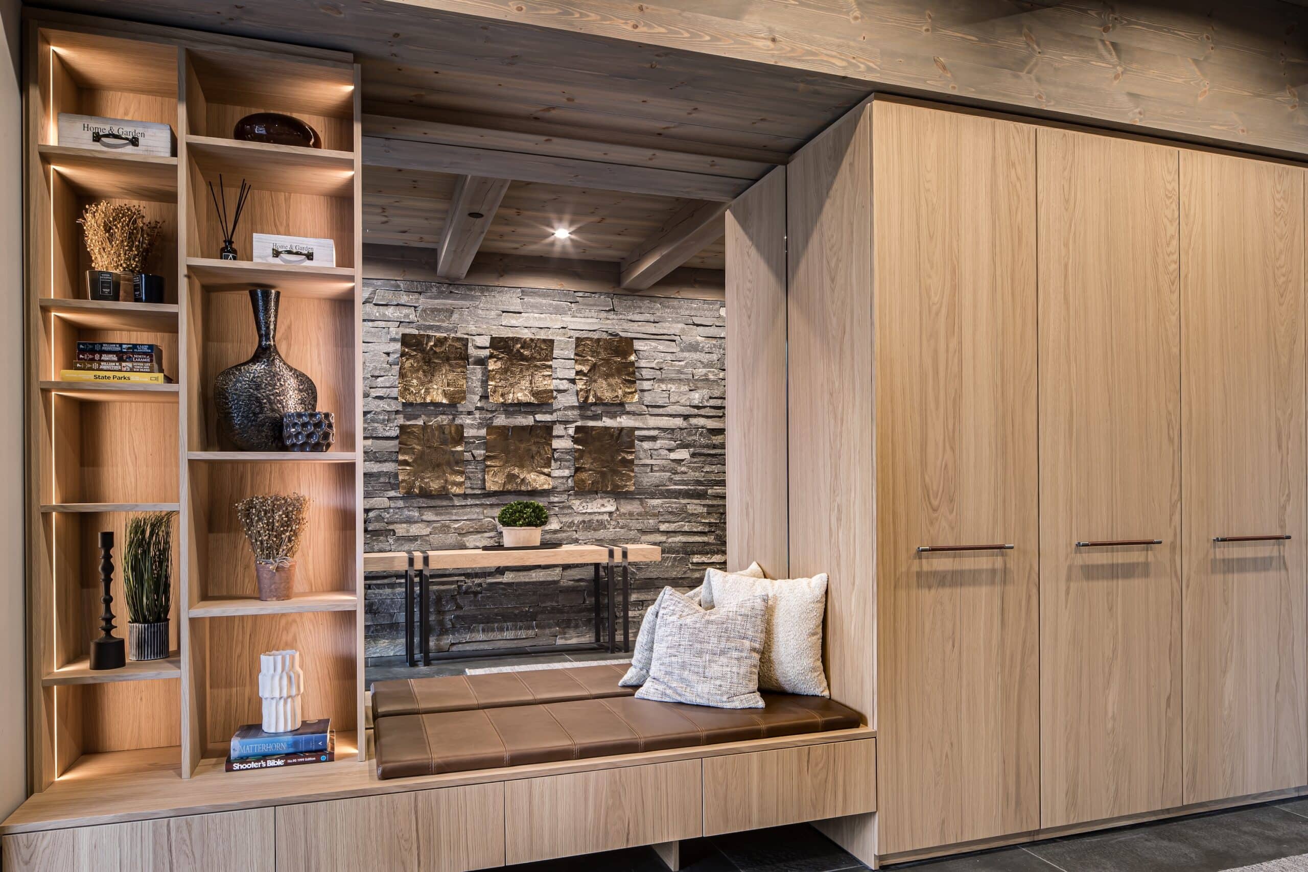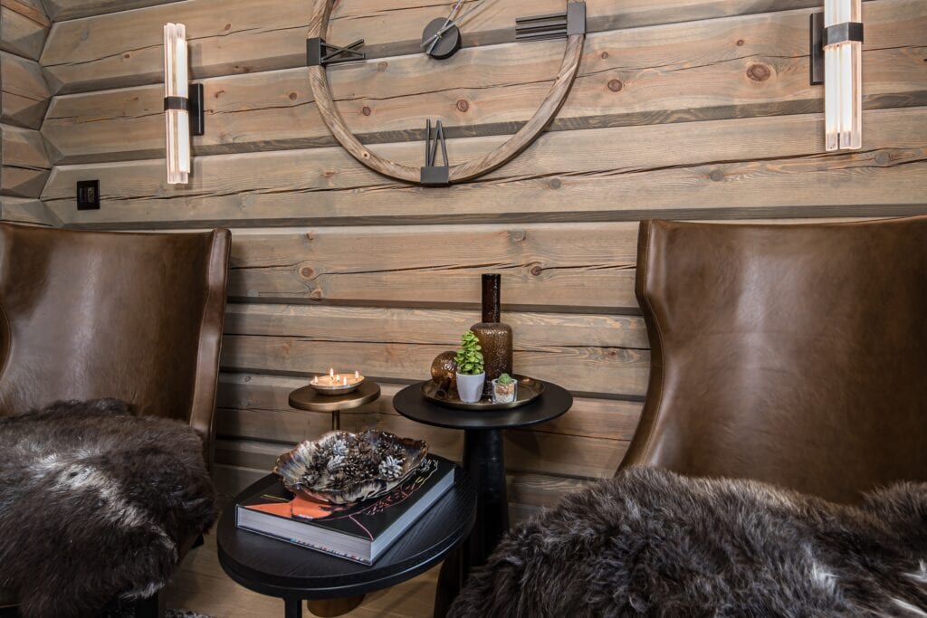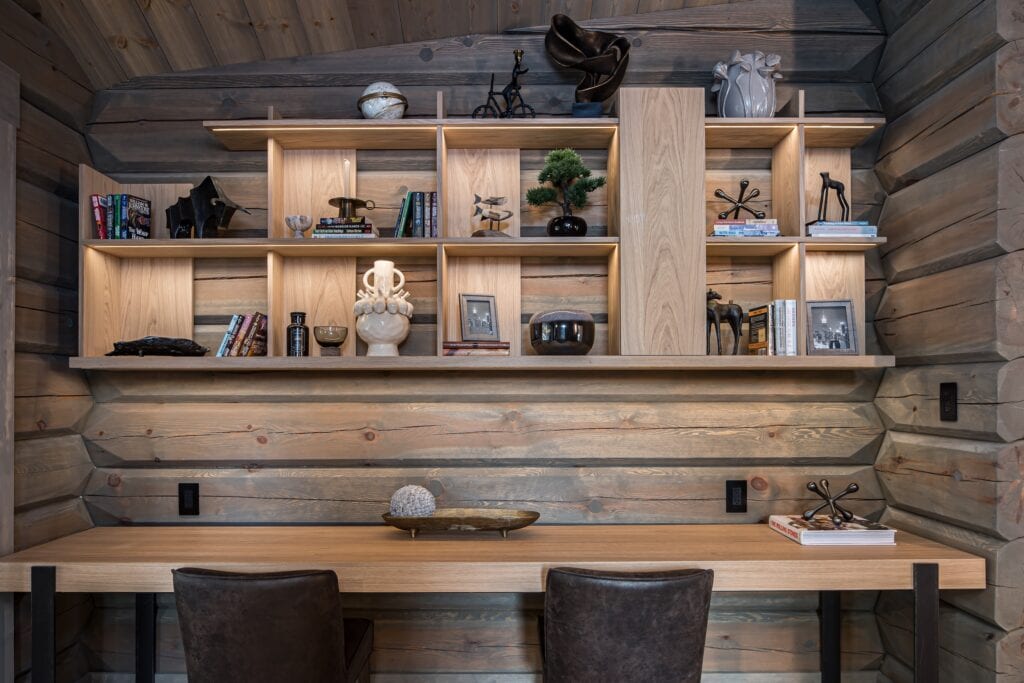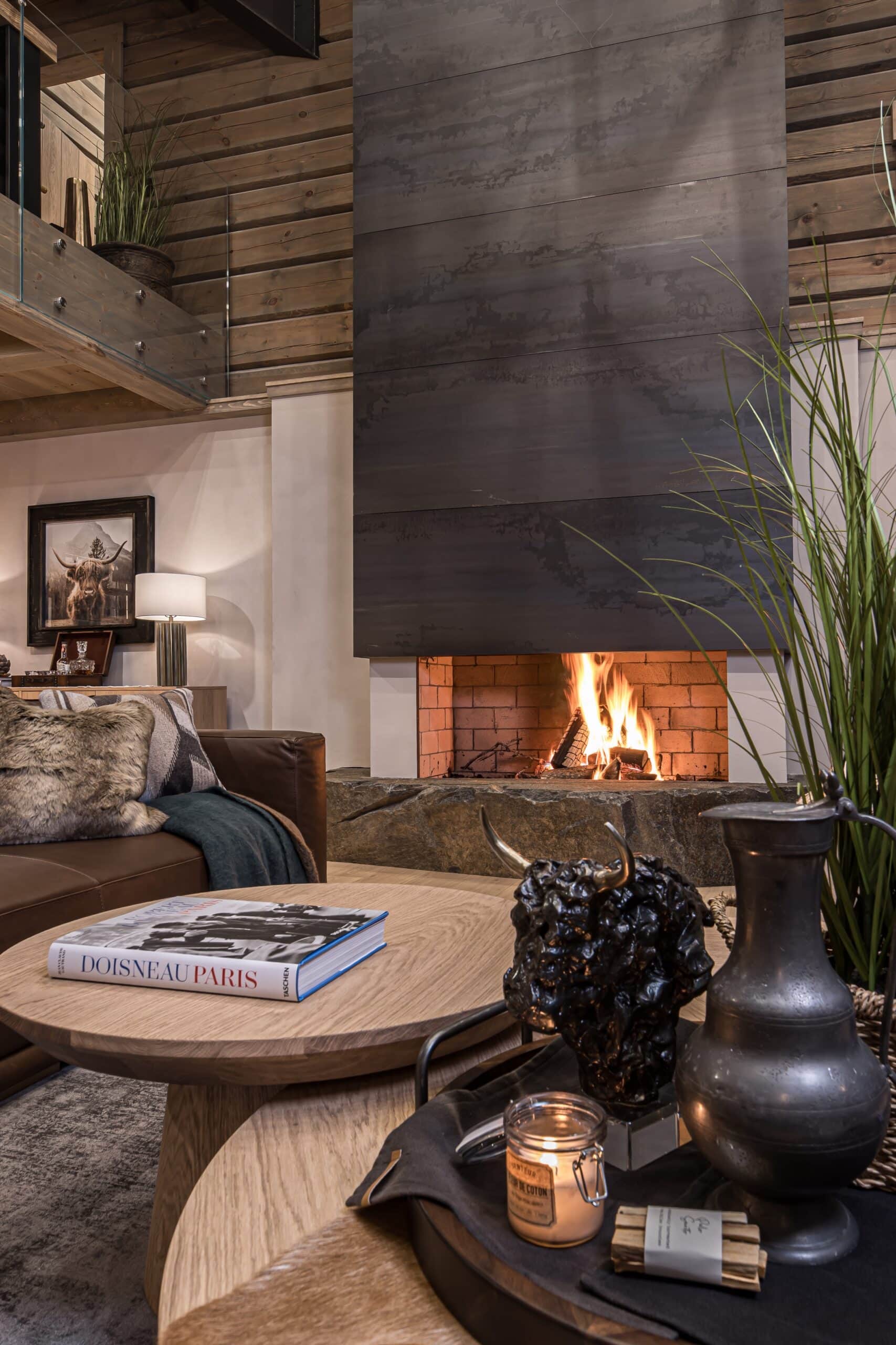 A framed birch-bark wall artwork, preserved and spot-lit within a solid oak structure, embraces the organic character of the interior. Completing the space, the architectural fireplace is seamlessly integrated into the room’s composition, its clean recessed firebox highlighting the natural flame as a refined visual centerpiece against oak, stone and glass.