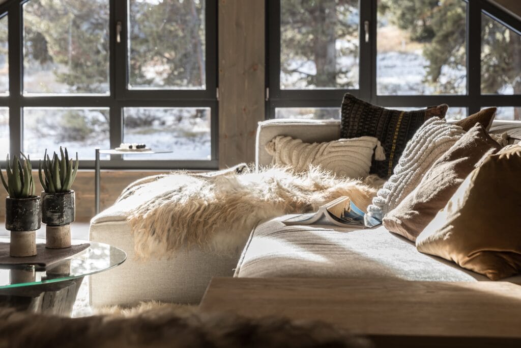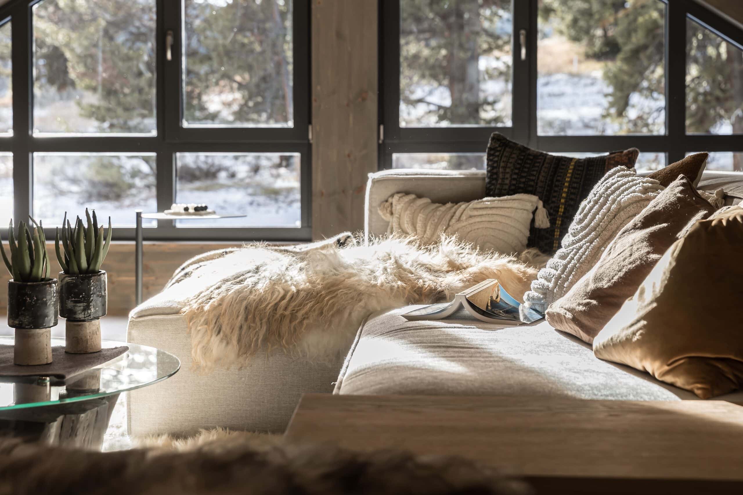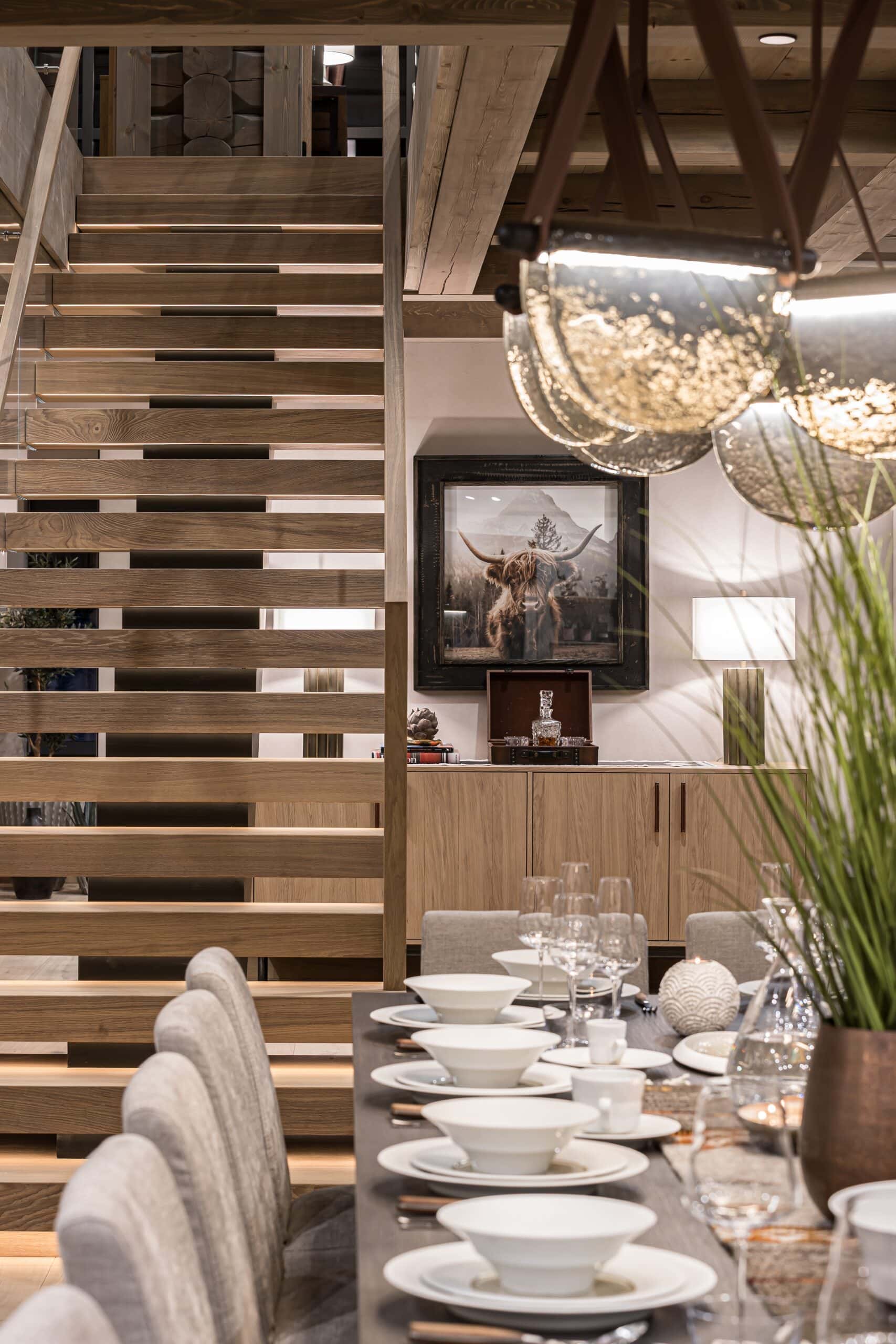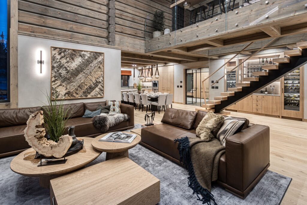 The kitchen flows effortlessly into the impressive double-height living room — a stunning architectural highlight of the home. Here, soaring ceilings rise to over eight metres, creating a powerful sense of openness and light, while expansive windows draw natural daylight deep into the interior throughout the day. A central fireplace adds warmth and atmosphere, making the living area a cosy yet refined centerpiece for gatherings after long days in the mountains.