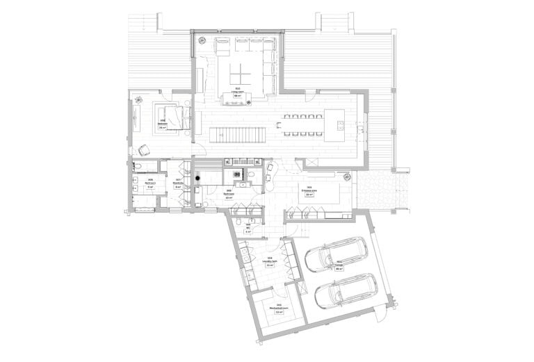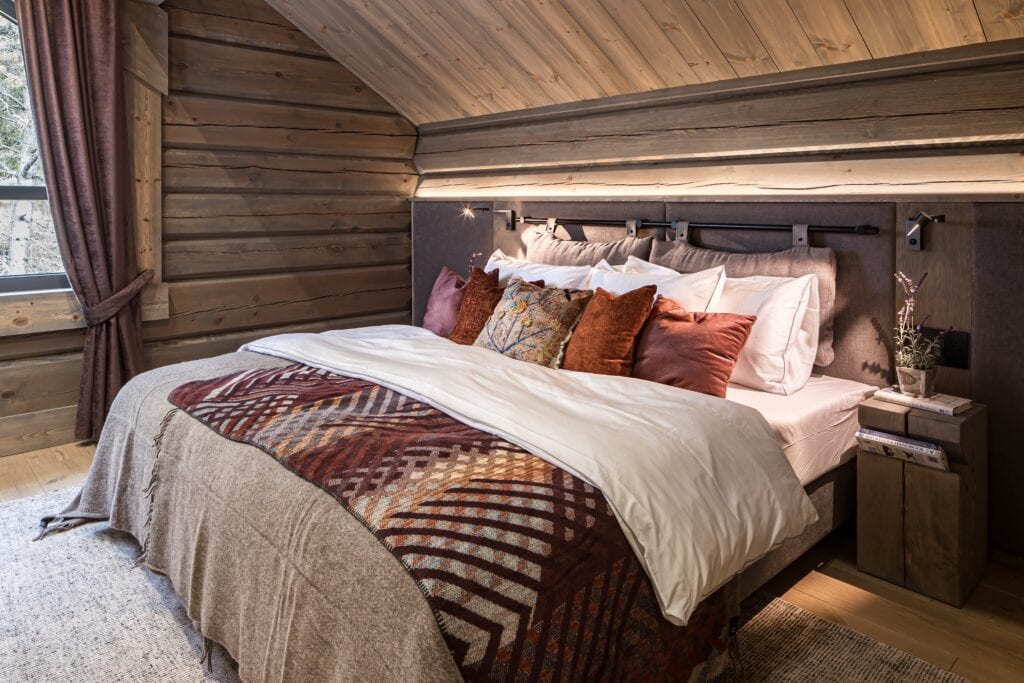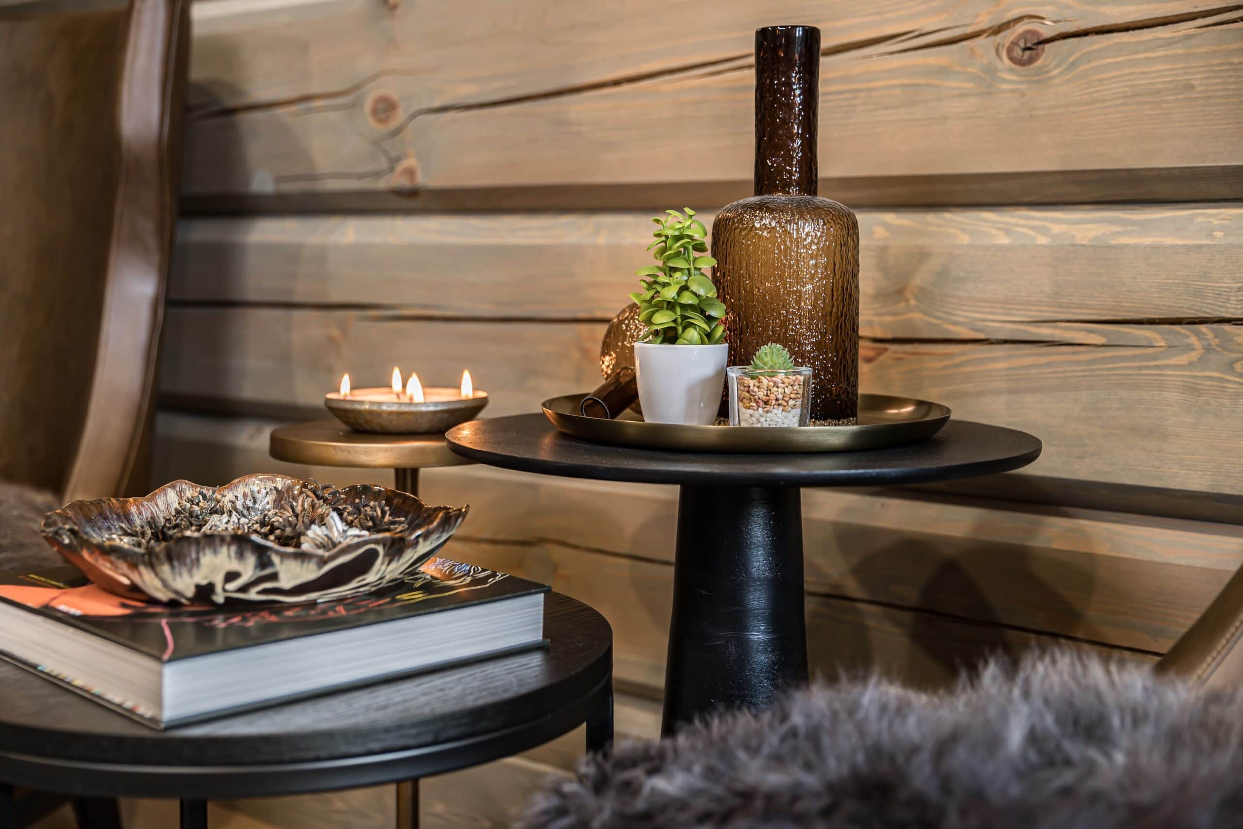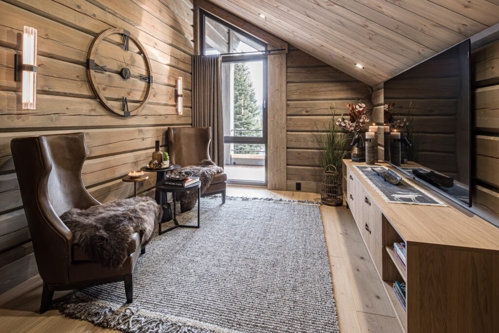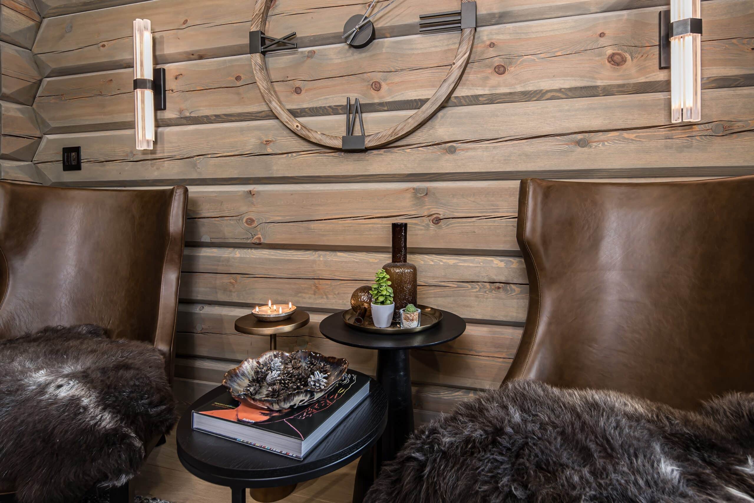 The kitchen flows effortlessly into the impressive double-height living room — a stunning architectural highlight of the home. Here, soaring ceilings rise to over eight metres, creating a powerful sense of openness and light, while expansive windows draw natural daylight deep into the interior throughout the day. A central fireplace adds warmth and atmosphere, making the living area a cosy yet refined centerpiece for gatherings after long days in the mountains.