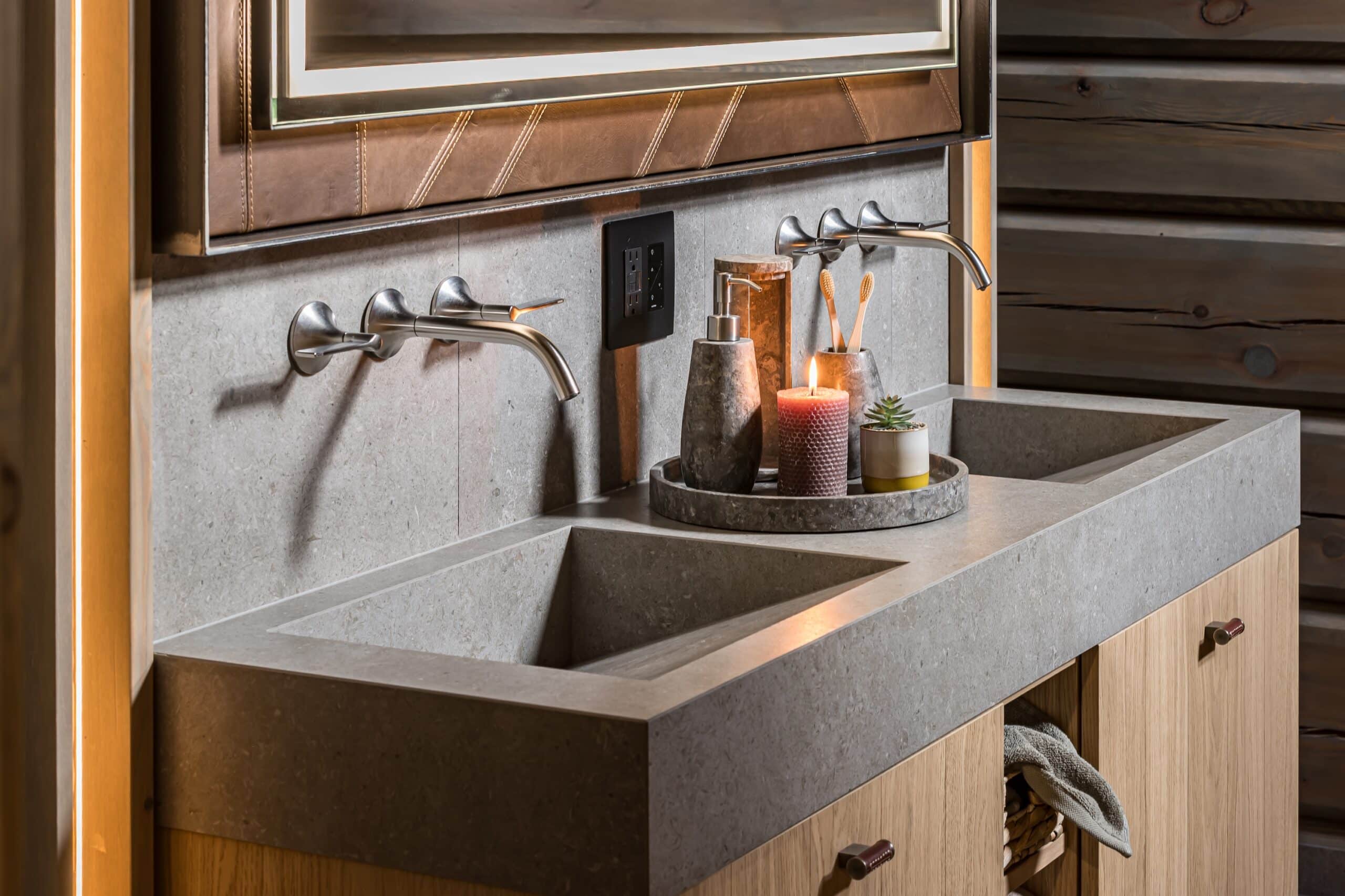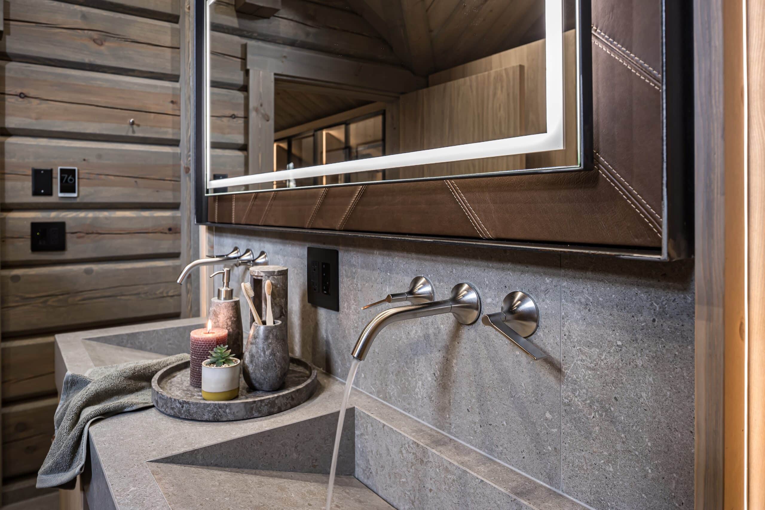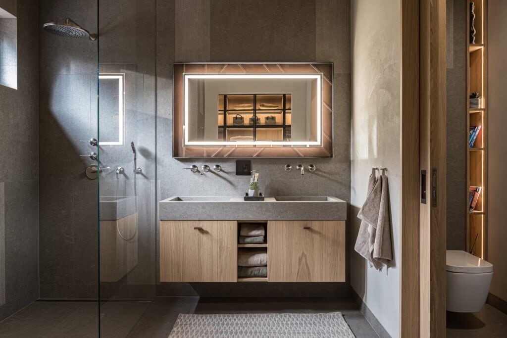 Bathrooms are finished to boutique-spa standard with heated floors, Spanish Bera & Beren tiles, Dornbracht faucets and shower systems, ceramic countertops with double integrated sinks, and brushed oak-veneered vanity cabinetry. Each space is enhanced by a bespoke leather-wrapped mirror, individually crafted by LHM Interior, featuring decorative stitching, integrated LED perimeter lighting and concealed metal framing for a refined “floating mirror” effect that is both elegant and practical.