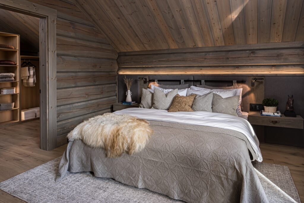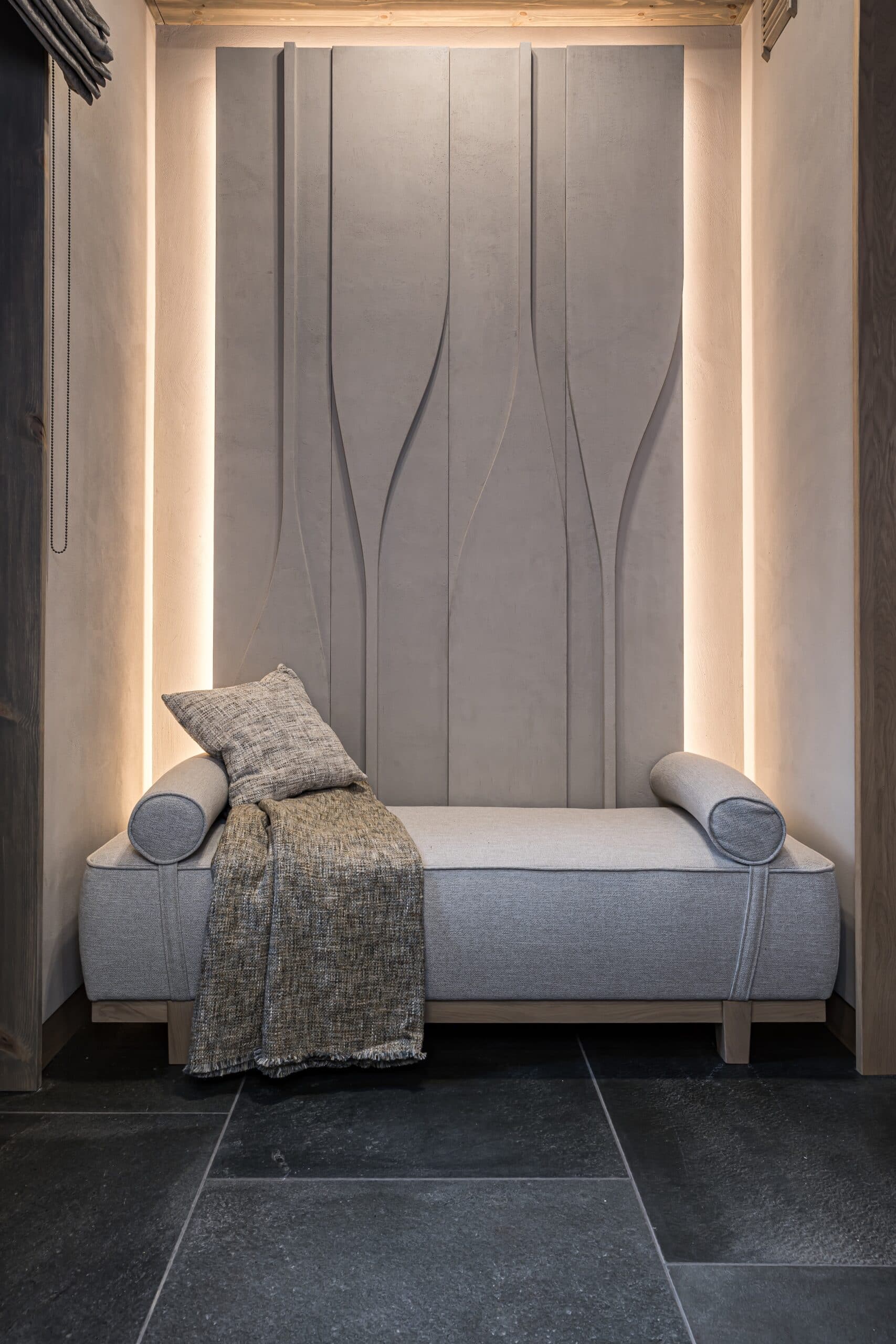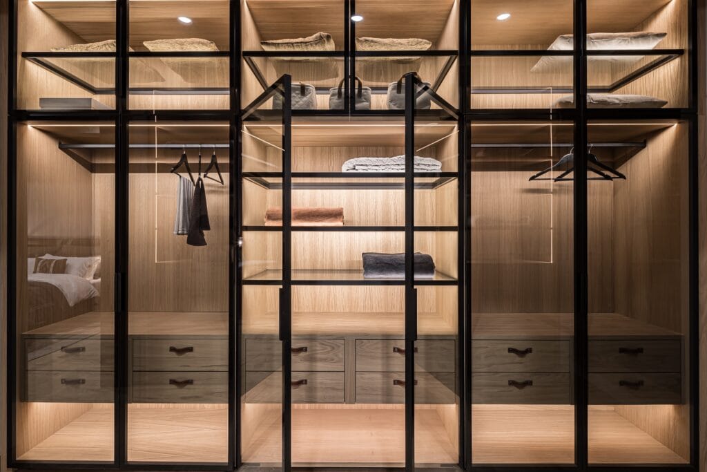 The residence offers four individually designed bedrooms, each with its own character while maintaining a cohesive design language throughout the home. Three bedrooms feature private en-suite bathrooms, with two also including walk-in wardrobes with illuminated glass doors powered by integrated LED systems. All bedrooms are furnished with custom-made beds, bespoke wardrobes and nightstands, upholstered headboards and carefully selected fabrics reflecting the home’s warm, natural palette. Layered lighting — combining concealed LEDs, reading lights and accent illumination — allows each room to transition seamlessly from functional to atmospheric comfort.