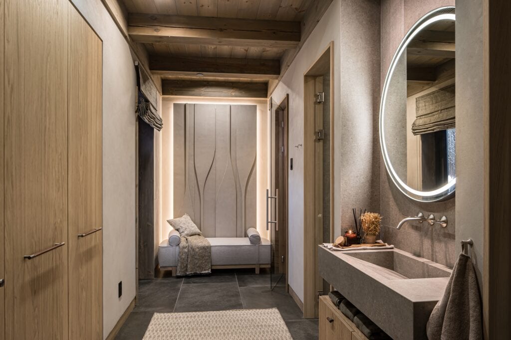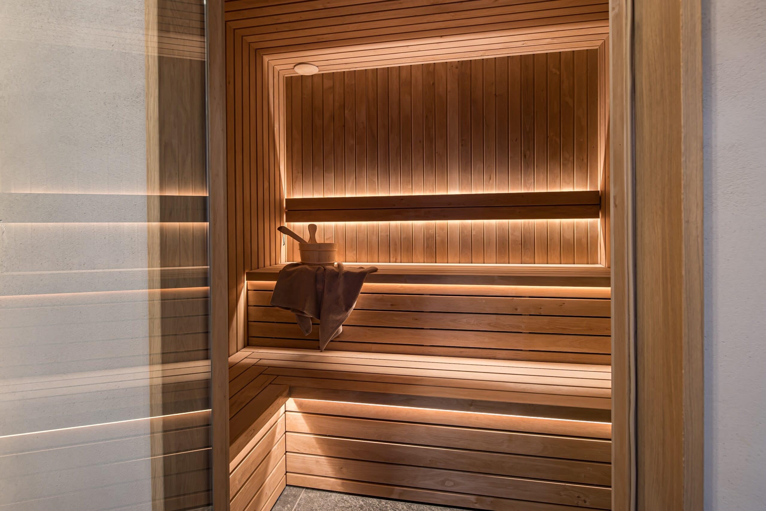 The ground floor is completed by a generously sized guest or master bedroom with integrated wardrobe space and direct terrace access. Nearby, a fully tiled spa-style bathroom features a private sauna and contemporary sanitary fittings — offering a perfect retreat for relaxation and recovery after outdoor adventures.