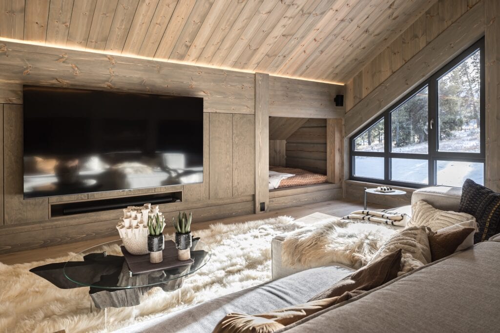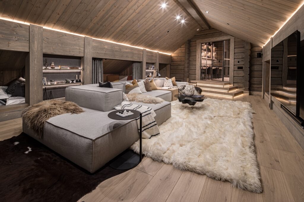 A cosy TV lounge and relaxation zone completes the upper floor — an ideal space for informal evenings, children’s activities, or additional guest sleeping arrangements. Elevated ceiling heights throughout this level enhance the light, airy ambiance while maintaining a comfortable sense of intimacy.